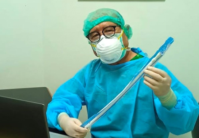 PERTOLONGAN PERTAMA: Dokter Poerwadi menunjukkan alat semacam pipa yang berfungsi sebagai wash out. (RS Darmo for Jawa Pos)