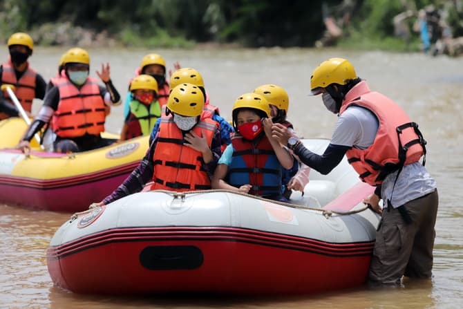 Anak-anak didampingi orang tua bergembira saat mengikuti rafting di kawasan bendungan Katulampa, Bogor, Kamis (29/10/2020). Kegiatan yang diadakan oleh Hiking Bocah dan dilakukan setiap akhir pekan atau libur panjang ini dalam rangka mengenalkan lingkung