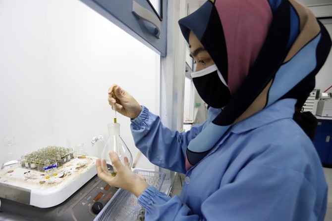 Peneliti menambakan cairan ke dalam sampel-sampel cairan herbal saat uji Lab obat herbal untuk penyembuhan COVID-19 dan penghambatan pertumbuhan virus corona di Lab Cara Pembuatan Obat Tradisional Baik (CPOTB) Pusat Penelitian Kimia LIPI, Serpong, Tangera
