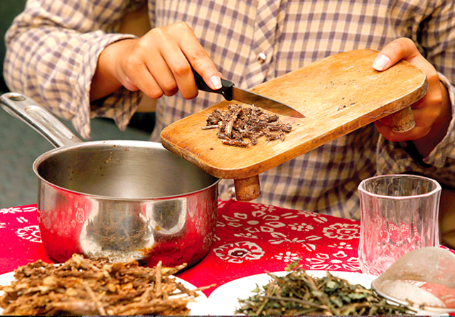 MERAMU: Air rebusan bratawali dan sambiloto dalam gelas. Meskipun memiliki rasa yang pahit, dua bahan itu memiliki khasiat yang sangat baik untuk kesehatan tubuh. Termasuk pendongkak imunitas tubuh. (Angger Bondan/Jawa Pos)