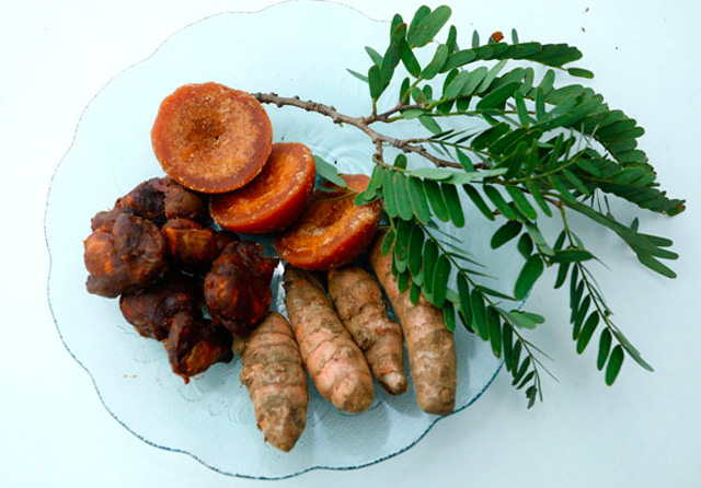 - Daun, kunyit, dan asam jawa direbus dalam air hingga mendidih dengan bantuan api berkekuatan sedang.
