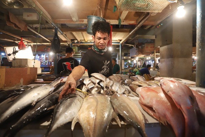Pedagang saat merapihkan berbagai jenis ikan laut di Pasar Senen, Jakarta, Senin (18/5/2020). Kementerian Kelautan dan Perikanan mengajak warga untuk banyak mengonsumsi ikan sehat bermutu untuk melawan virus corona. Kandungan nutrisi pada ikan seperti se