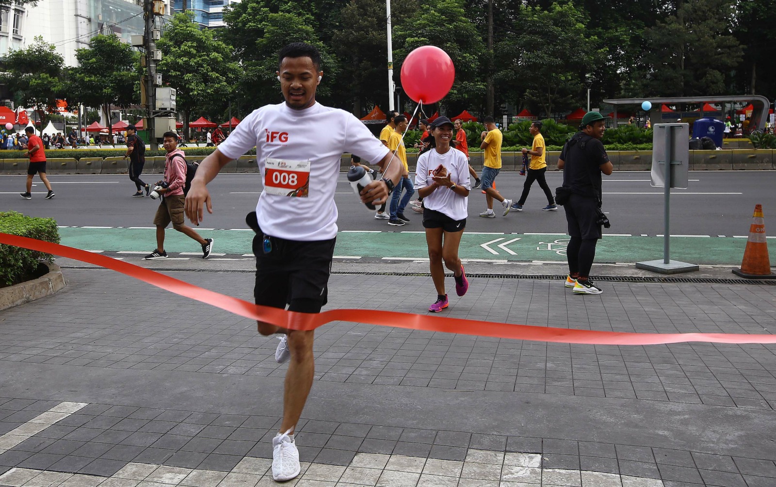 Suasana Road to IFG Labuan Bajo Marathon 2022 di Sudirman, Jakarta, Minggu (2/10/2022). Ratusan jurnalis dari berbagai media mengikuti ajang lomba lari untuk mendapatkan tiket beserta akomodasi ke IFG Labuan Bajo Marathon 2022 yang akan digelar pada 29 Ok