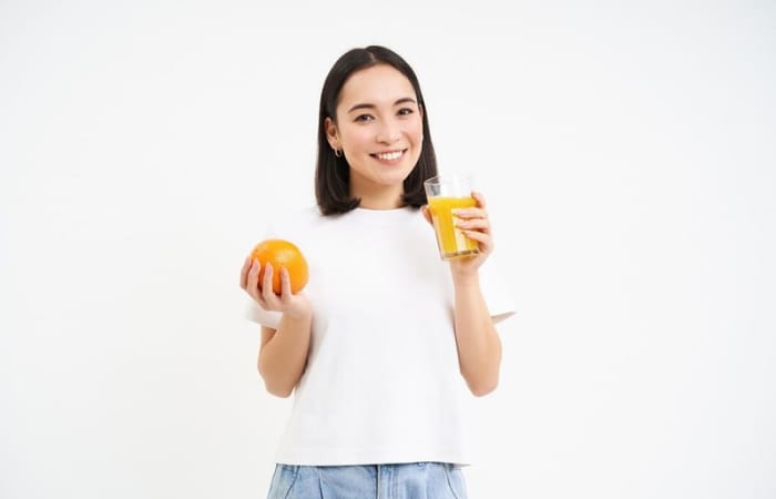 Ilustrasi perempuan yang minum smoothie jeruk untuk meningkatkan sistem kekebalan tubuh (freepik/benzoix)