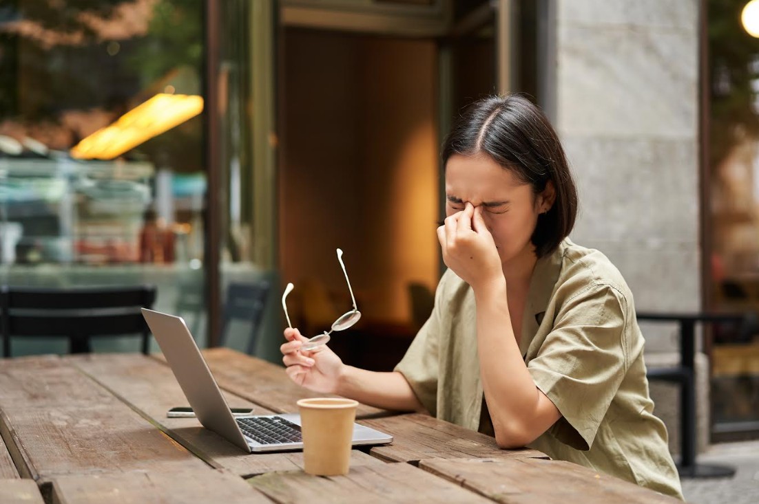 Ilustrasi orang yang mengalami kelelahan mata karena terlalu lama menggunakan gadget.