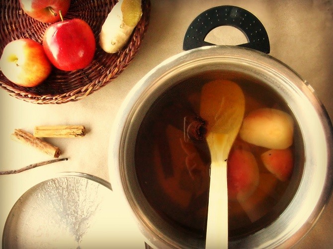 Rebus 3 gelas air dengan potongan apel dan jahe. Biarkan mendidih selama 10-12 menit untuk memastikan khasiat apel dan jahe terendam dalam air. Matikan api dan biarkan dingin selama beberapa menit.