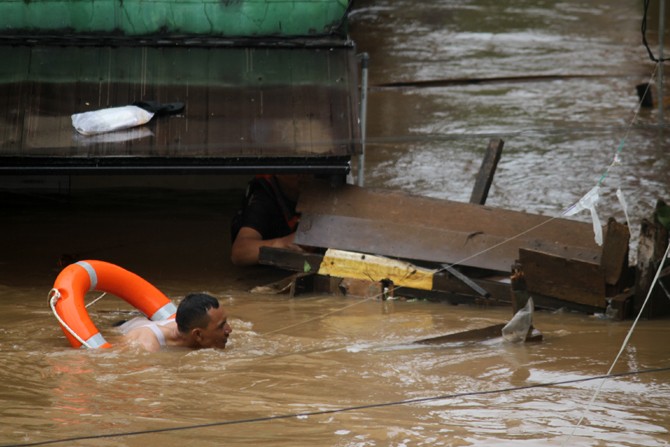 Warga beraktivitas ketika banjir di kawasan Cipinang Melayu, Jakarta, Rabu (1/1/2020). Banjir yang terjadi di kawasan tersebut akibat luapan air dari Kali Sunter.  Foto: Dery Ridwansah/ JawaPos.com - Image