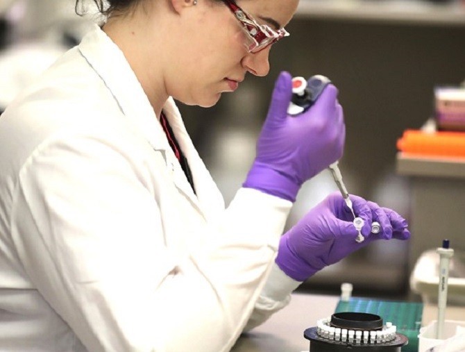 In this March 10, 2020, photo, Heather Peters, a lab technologist, works in the extracting of RNA from test samples in the Mayo virology lab at the Mayo Clinic Superior Drive facility in Rochester, Minn. Vice President Mike Pence has an appointment Tuesda
