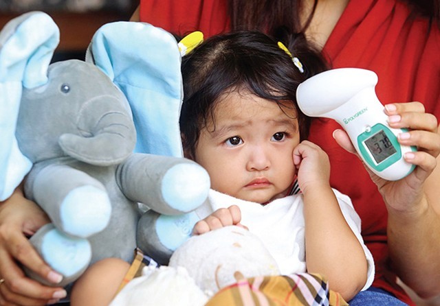 TIDAK PANIK: Maria Elisea Kimora mengukur suhu tubuh sang anak, Pia Mikayla Alesha, di rumahnya Jumat (24/4). Suhu tubuh anaknya yang di atas 37,5 derajat Celsius dapat dinyatakan demam. Maria mengompresnya untuk menurunkan demam sambil terus memantau kon - Image