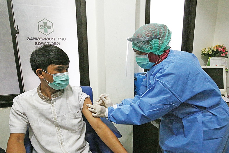 SIMULASI: Petugas medis bersiap menyuntikkan vaksin Covid-19 di Puskesmas Tapos, Depok, Kamis (22/10). (MIFTAHULHAYAT/JAWA POS)