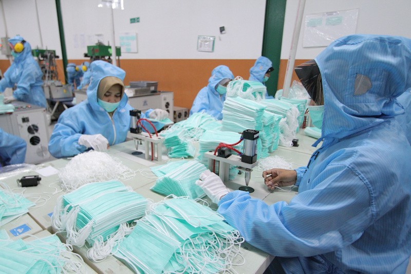Pekerja menyelesaikan pembuatan masker medis di PT Multi One Plus, Gunung Putri, Kabupaten Bogor, Jawa Barat, Rabu (15/4/2020). Pabrik masker tersebut mampu memproduksi 250 ribu setiap hari. Foto : Hendinovian / Radar Bogor