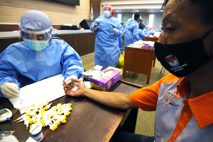 SYARAT WAJIB: Petugas kesehatan mengambil sampel darah anggota KPPS yang mengikuti tes cepat Covid-19 di Kantor Wali Kota Depok, Jabar, Senin (16/11) lalu. Sebelum bertugas, para petugas KPPS itu wajib dinyatakan bebas Covid-19. (MIFTAHUL HAYAT/JAWA POS)