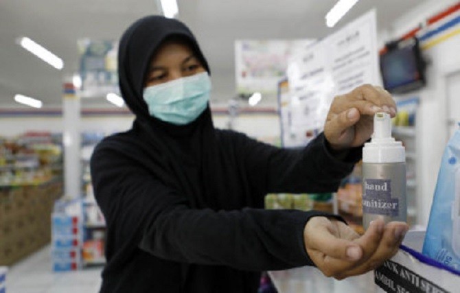 Salah seorang pembeli di ritel moderen Indomaret saat memakai handsinitizer seusai berbelanja untuk mencegah penularan covid 19. Jumat (27/03/2020). foto Puguh Sujiatmiko/Jawa Pos