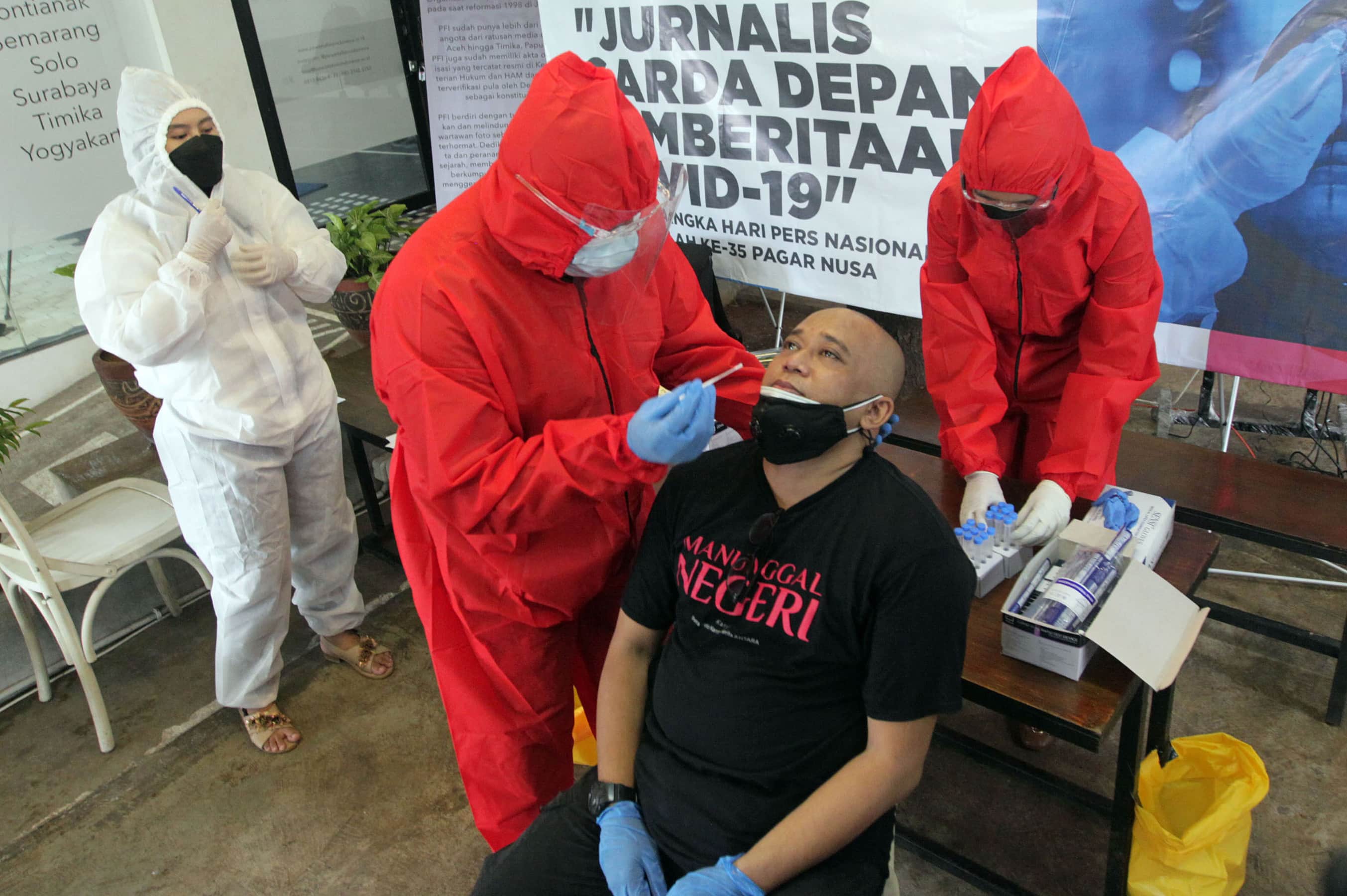 Pewarta foto mengikuti Swab Tes Antigen Covid-19 secara gratis bagi Pewarta Foto di Sekretariat PFI, Ampera, Jakarta, Minggu (14/2/2021). Swab Antigen Covid-19 bagi Pewarta Foto tersebut dalam rangka memperingati Hari Pers Nasional 2021. Dok PFI