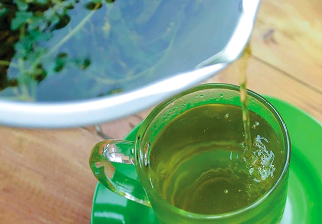 SIAP MINUM: Air rebusan daun meniran dituang ke dalam gelas. Perebusan disarankan menggunakan panci stainless steel. (Alfian Rizal/Jawa Pos)