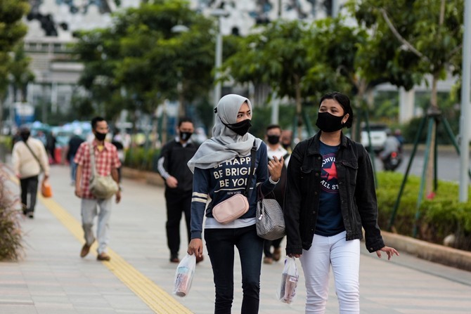Pejalan kaki melintas di trotoar Jalan Jenderal Sudirman, Jakarta, Rabu (13/5/2020). Kepala Gugus Tugas Percepatan Penanganan COVID-19 mengizinkan warga berusia di bawah 45 tahun untuk bekerja demi redam maraknya pemutusan hubungan kerja (PHK), karena bat