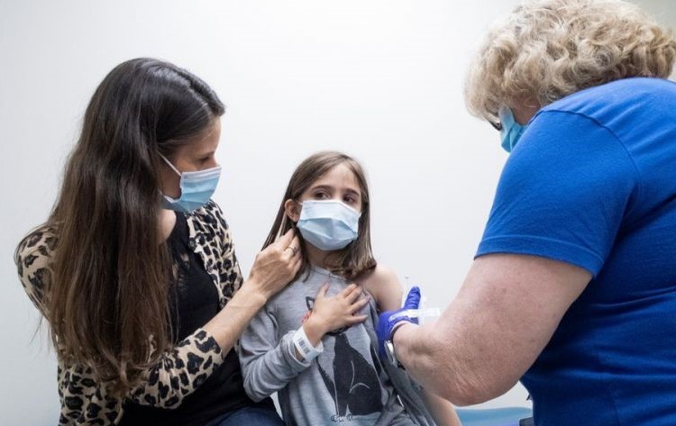 Marisol Gerardo, 9 tahun, ditemani ibunya saat menerima dosis kedua vaksin COVID-19 dari Pfizer dalam uji klinis bagi anak-anak di Duke Health, Durham, North Carolina, AS, April 2021. (ANTARA/Reuters/as)