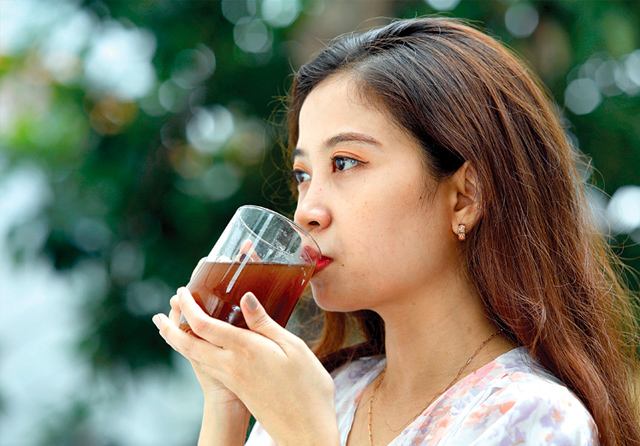 MENYEHATKAN: Dheajeng D.H. mencicipi rebusan air asam jawa yang dicampur gula secukupnya. Kandungan pada buah asam memiliki khasiat, antara lainm, untuk menurunkan kadar gula darah. (Angger Bondan/Jawa Pos)