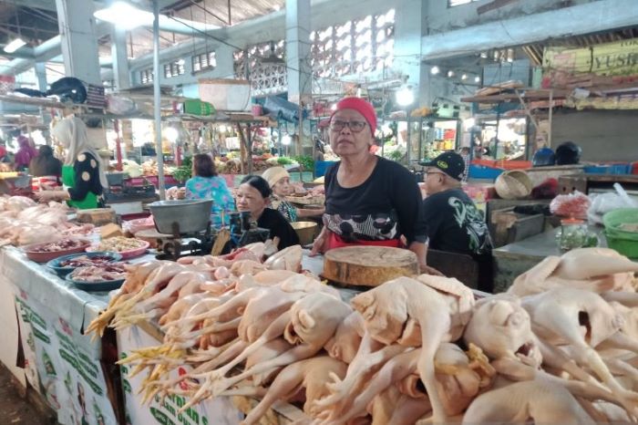 Pedagang daging ayam ras di Pasar Tanjung Jember, Senin (10/4).