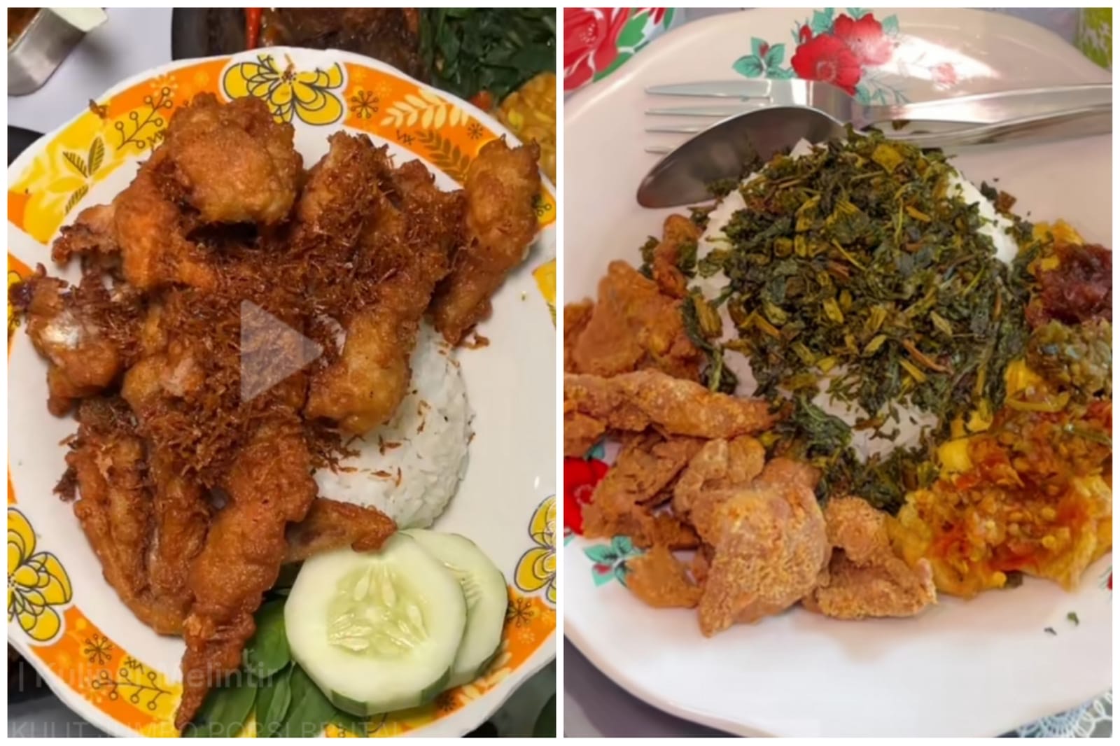 Foodvlogger Freda Pria sudah membuktikan betapa renyah dan gurihnya kulit goreng di sini. Dalam satu porsi nasi kulit terdapat juga tumis buncis dan sambal.