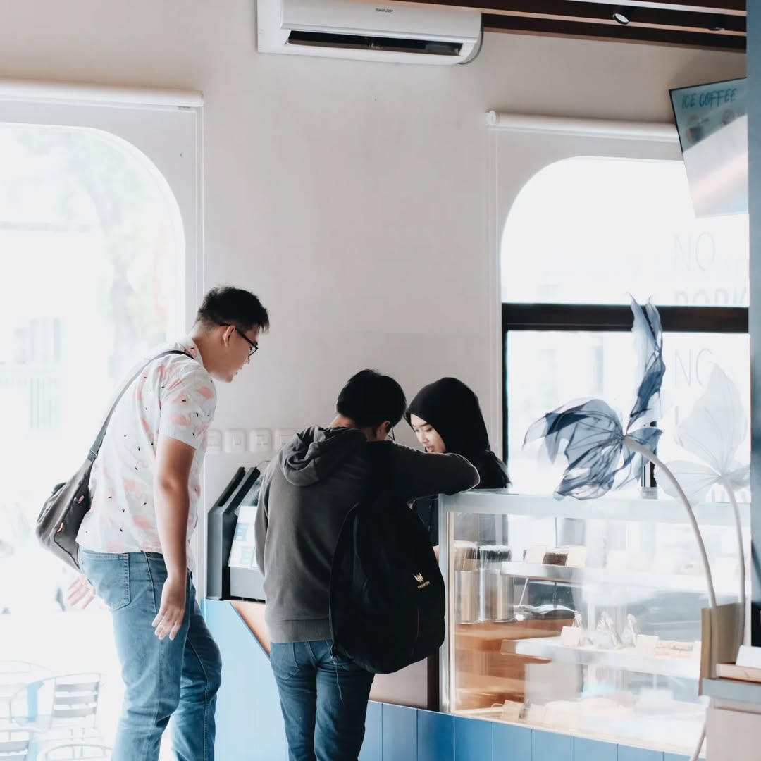 Kafe ini mengusung tema dengan konsep minimalis modern dengan dominasi warna putih, biru cerah dan warna cerah lainnya.