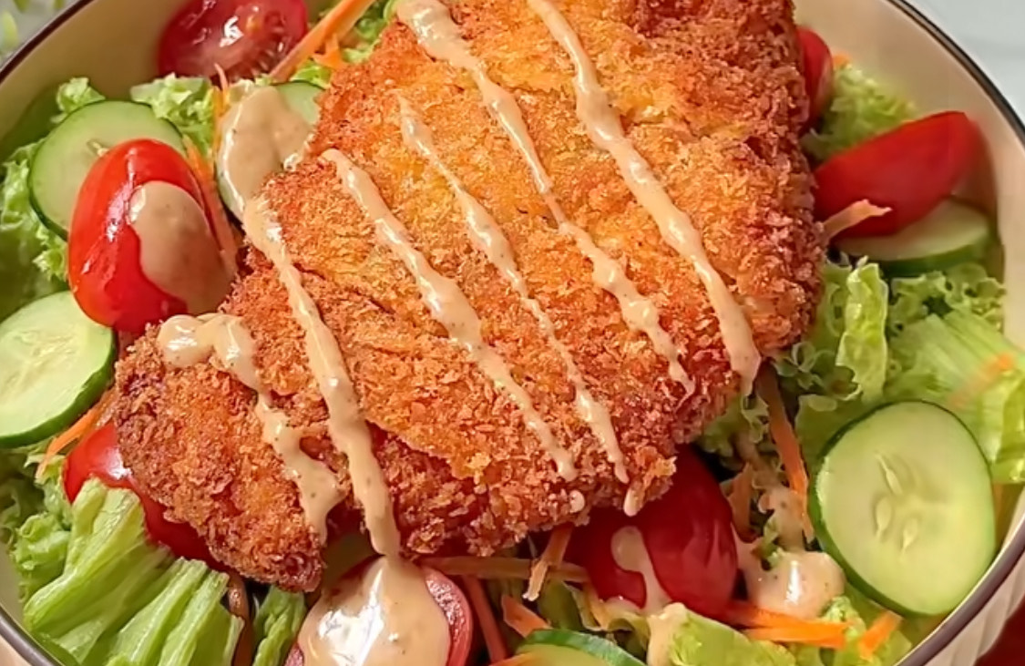Perpaduan ayam crispy yang gurih dengan sayuran segar menciptakan sensasi seimbang: renyah, juicy, dan tetap ringan. Ditambah dressing wijen, rasanya makin harum dan nikmat tanpa berlebihan.