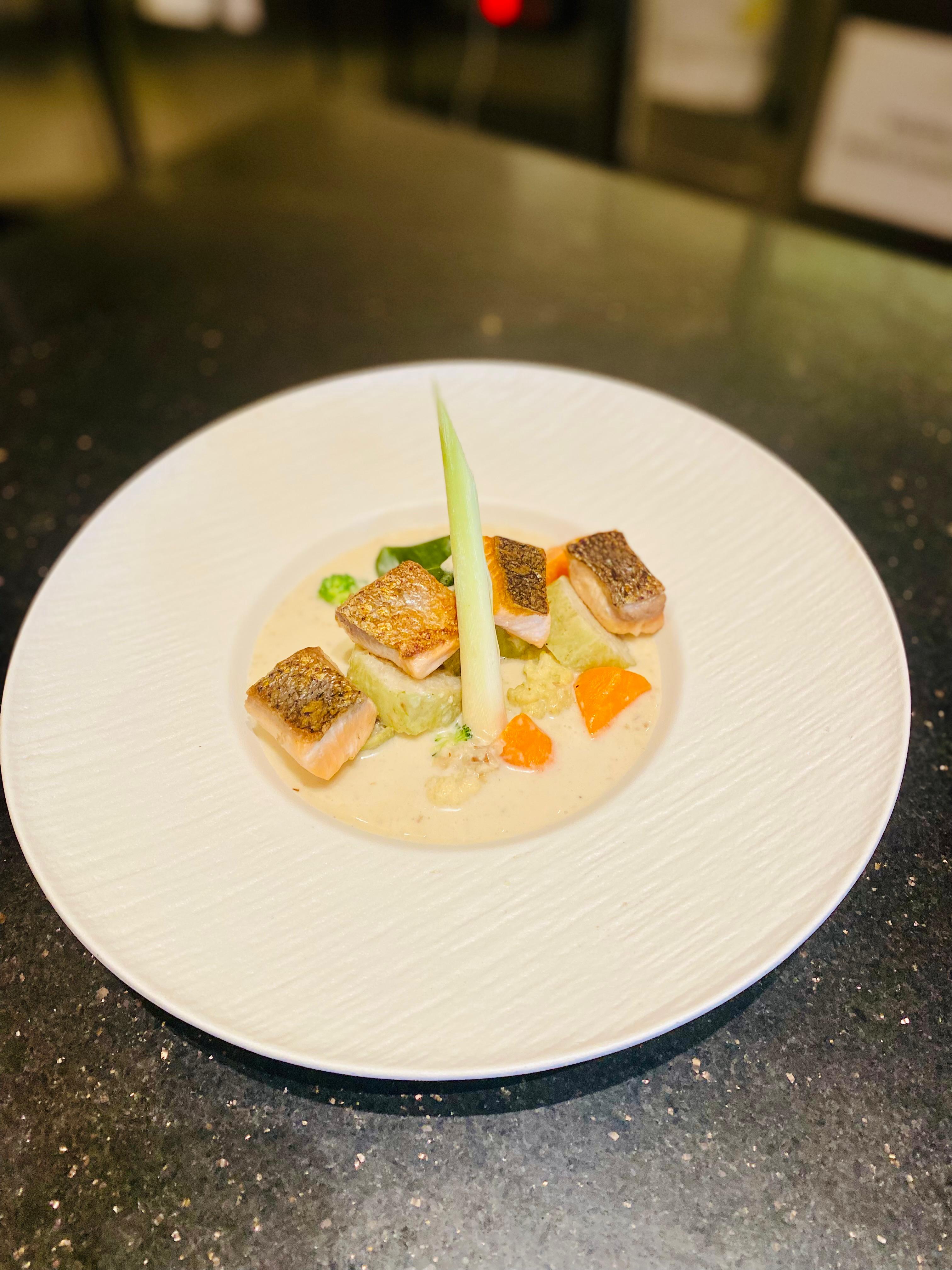 Salmon Opor ala Hotel Ciputra World Surabaya — paduan gurih santan Nusantara dan lembutnya salmon dalam tampilan modern nan elegan. (Juliana Christy /Jawa Pos)