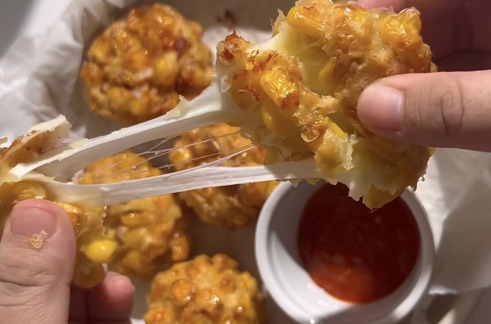 Lelehan keju saat dibelah membuat corn cheese balls terlihat menggoda dan langsung bikin lapar.