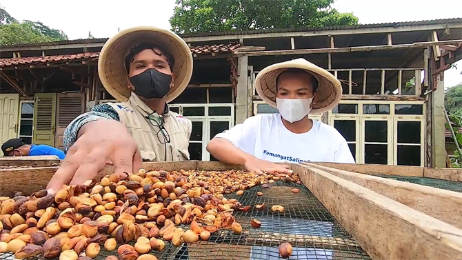 Tokoh Penggerak DSA Temanggung Sofiyudin Achmad (kiri) bersama dengan seorang anggota Kelompok Usaha Bersama (kanan) menunjukkan proses menjemur kopi dengan proses honey menggunakan media para-para (drying). (Astra for JawaPos.com)