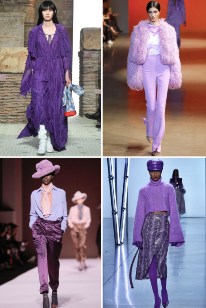 Kejayaan warna ungu dari pastel lilac hingga violet masih digemari para desainer. Semua yang ada saat runway, menampilkan ungu sebagai warna yang cocok untuk musim gugur 2019 dalam gaun, mantel, sweater, dan bahkan topi. Untuk mengambil tren yang lebih lembut, pilih warna lavender atau lilac.
