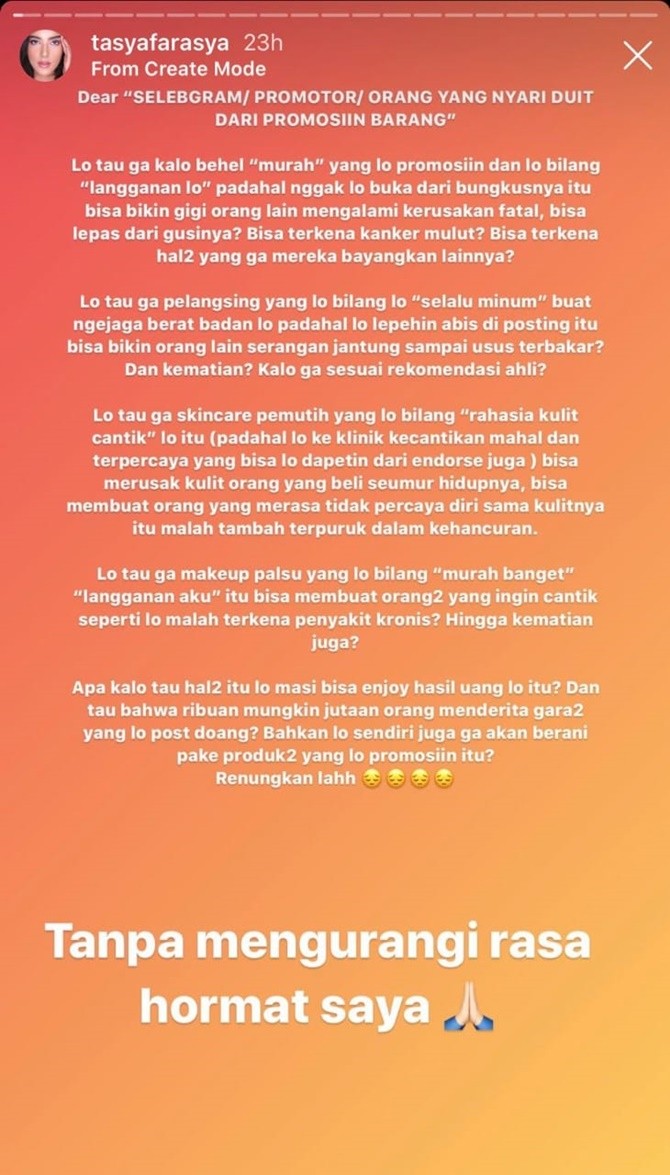 Dalam postingan-nya baru-baru ini, Tasya mengingatkan agar para selebgram bisa lebih jujur dan bijak lagi saat memilih produk kecantikan yang akan dipromosikan. Dia juga mengungkapkan soal selebgram yang sering memberikan ulasan palsu, padahal dia sendiri mungkin tidak pernah menggunakan produk yang dipromosikannya. Tasya mengatakan, produk palsu yang dipromosikan tersebut bisa berdampak fatal untuk kesehatan.