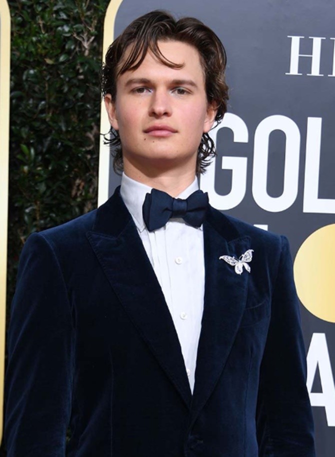 Elgort, yang menghiasi setelan Tom Ford head-to-toe dengan bros kupu-kupu berlian karya Tiffany Enchant. Dia memilih gaya minimalis dengan menambahkan aksesori pin emas putih Cartier Juste un Clou 18-karat emas di kerahnya.