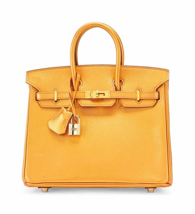 Tas kulit Hermes paling mahal yang dijual adalah Metallic Bronze Chèvre Leather Birkin 25 yang langka dengan Gold Hardware. Tas itu dijual pada 12 Desember 2017, di Christie's Paris seharga USD 109.500 atau Rp 1,5 miliar.