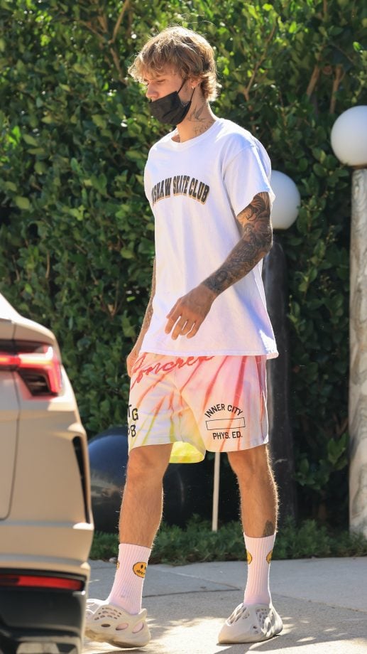 Sebelumnya Justin Bieber juga pernah mengenakan alas kaki sandal karet warna cokelat dengan kaos kaki warna putih. Gaya itu ditampilkannya saat berjalan bersama sang istri dan tetap memakai masker.