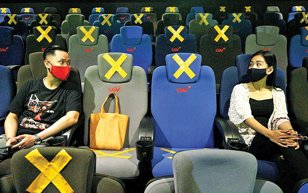 BERJARAK: Bioskop di Jakarta kemarin kembali beroperasi dengan pembatasan penonton maksimal 25 persen dari total kapasitas. (MIFTAHULHAYAT/JAWA POS)