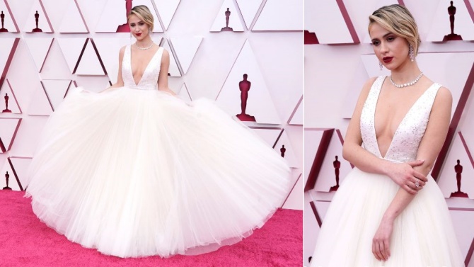 Ada pula sosok Emerald Fennell, calon sutradara terbaik yang sedang hamil tersenyum cerah dengan gaun musim semi hijau dan merah muda. Dia melengkapi tampilan dengan eye shadow ungu berkilau.