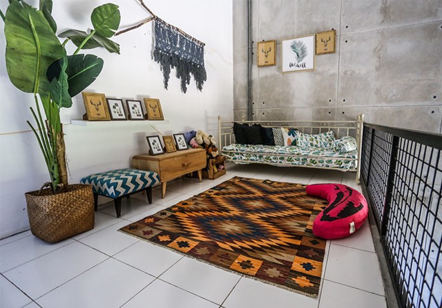 MIX & MATCH: Tembok unfinished dan pembatas dari besi mewakili gaya industrial. dipadukan dengan karpet bercorak tribal dan tanaman yang terkesan tropikal. (Riana/Jawa Pos)