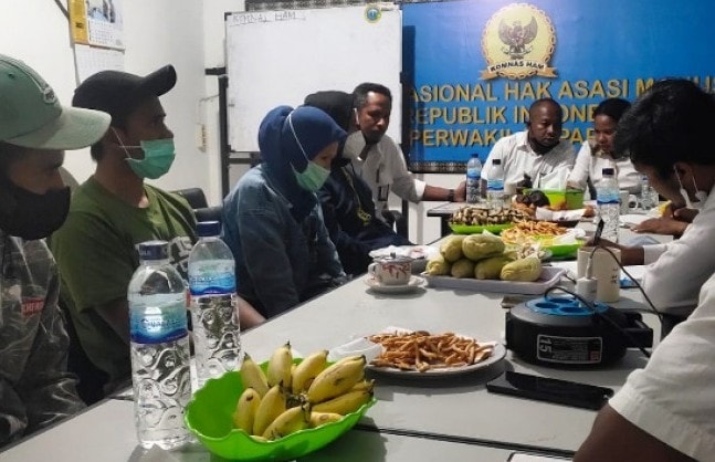 Kepala Kantor Komnas HAM Perwakilan Papua Frits B. Ramandey bersama staf menerima pengaduan tenaga kesehatan korban kekerasan KKB Kiwirok, Pegunungan Bintang, di Kantor Komnas HAM Papua, Jayapura, Selasa (21/9). Komnas HAM Perwakilan Papua/Antara