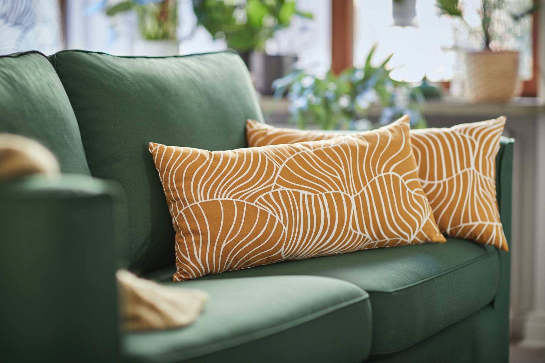 Jika warna sofa berwarna netral, Anda bisa menambahkan bantal kecil bercorak. Warna earth tone bantal ini cocok dipadukan dengan sofa berwarna netral, coklat, atau warna bernuansa dingin.