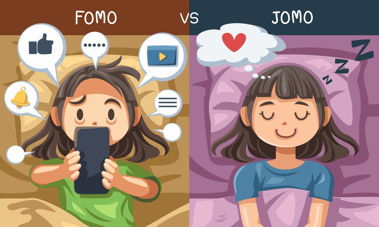 Ilustrasi perbadingan orang yang FOMO vs JOMO. (Freepik/jcomp)