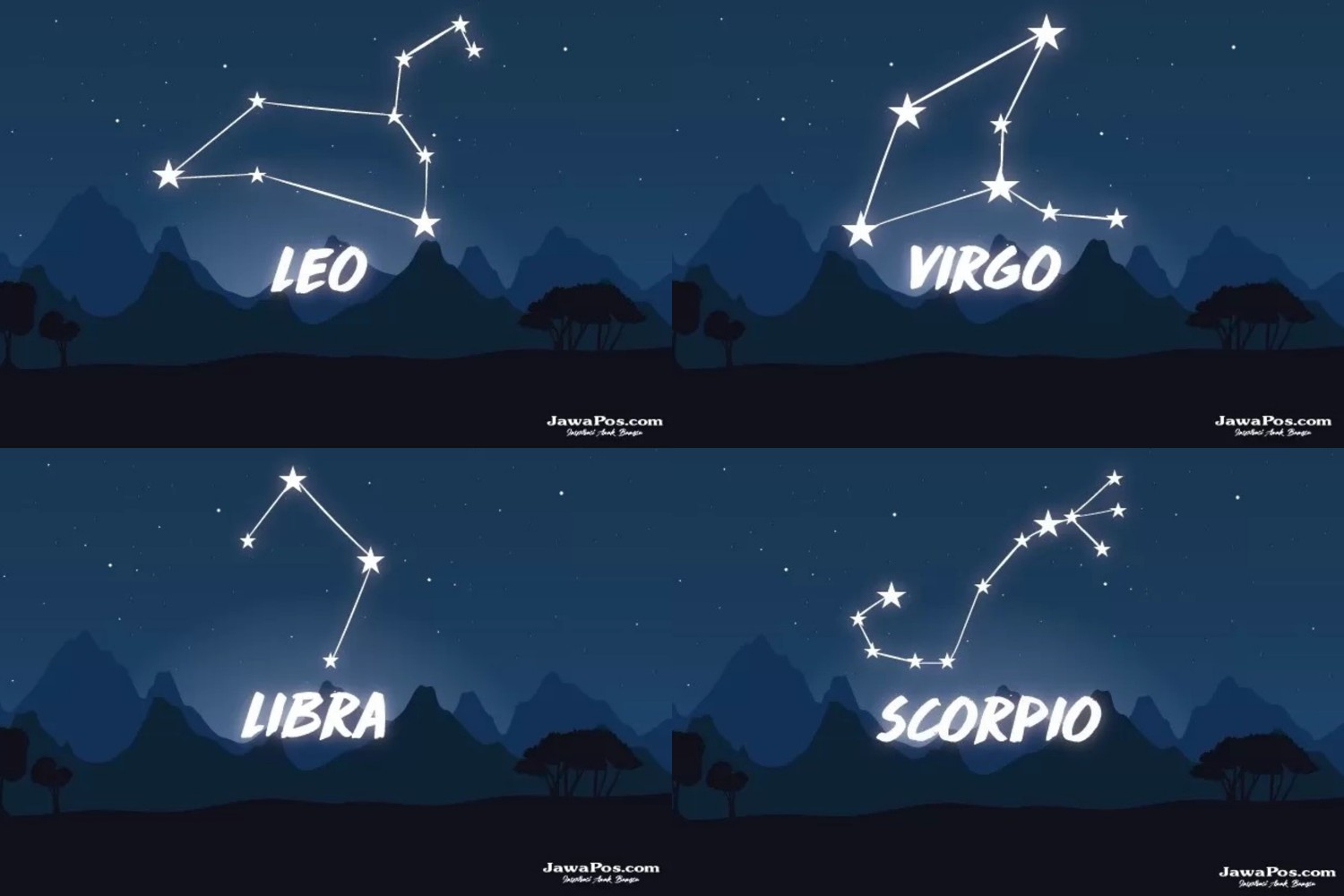 ilustrasi zodiak Leo, Virgo, Libra, dan Scorpio. Sumber foto: Dok/JawaPos.com