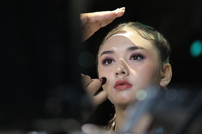 Proses make-up Wardah Equator Treasure saat di panggung Indonesia Fashion Week.