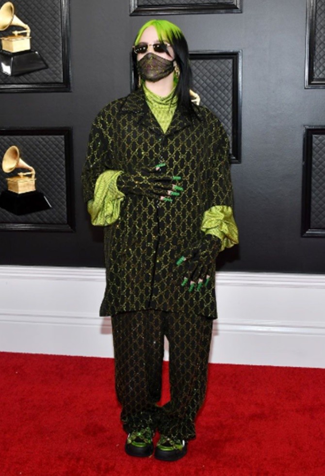 Busana terbaiknya terkesan nyentrik dan eksentrik. Di balut label Gucci membuat Billie Eilish tampil keren. Gayanya yang unik dengan Gucci membuatnya glamor.