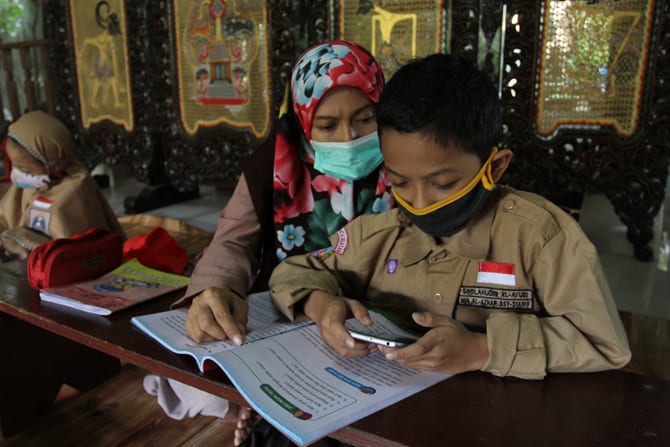 Sejumlah anak-anak sekolah mengikuti belajar secara daring atau online dengan fasilitas WiFi yang disediakan secara gratis oleh warga di Perumahan Pondok Mulya I, Beji, Depok, Rabu (29/7/2020). WiFi gratis ini oleh warga sekitar kompleks perumahan sebagai