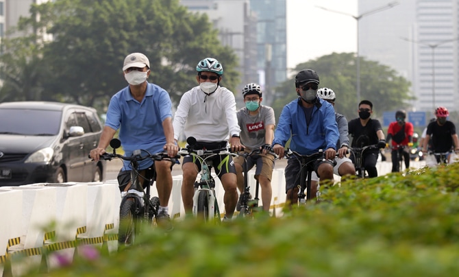 Pesepeda melintas di Jalan Jenderal Sudirman, Jakarta, Minggu (6/6/2021). Gubernur DKI Jakarta Anies Baswedan berencana menambah jalur sepeda sepanjang 101 kilometer di Jakarta pada tahun 2021 yang bertujuan untuk memfasilitasi warga agar dapat bersepeda