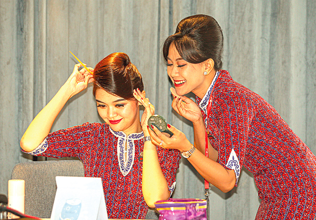 Sebelum terbang, para pramugari wajib berdandan. Tak hanya make-up, mereka juga harus menyanggul rambut. Tiga jam sebelum estimated time of departure (ETD), pramugari harus siap sedia.