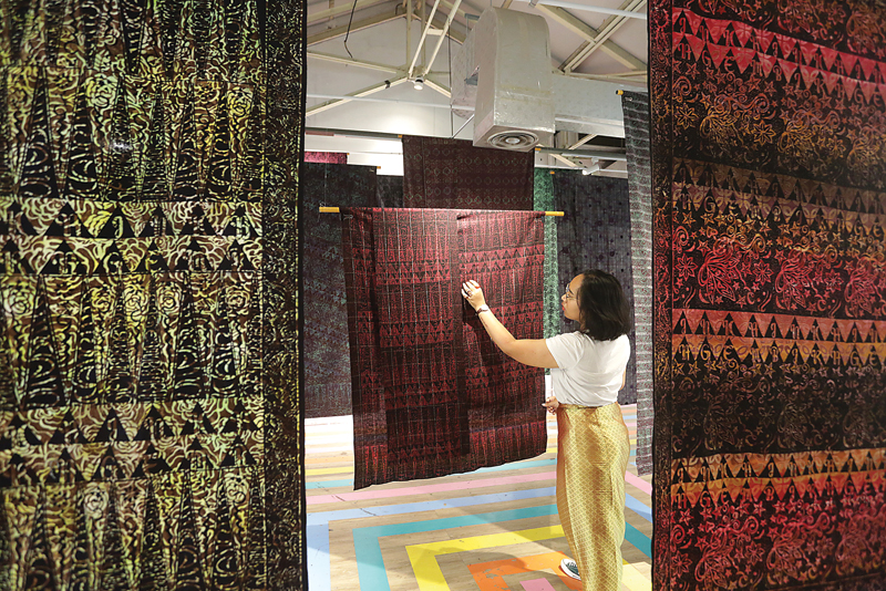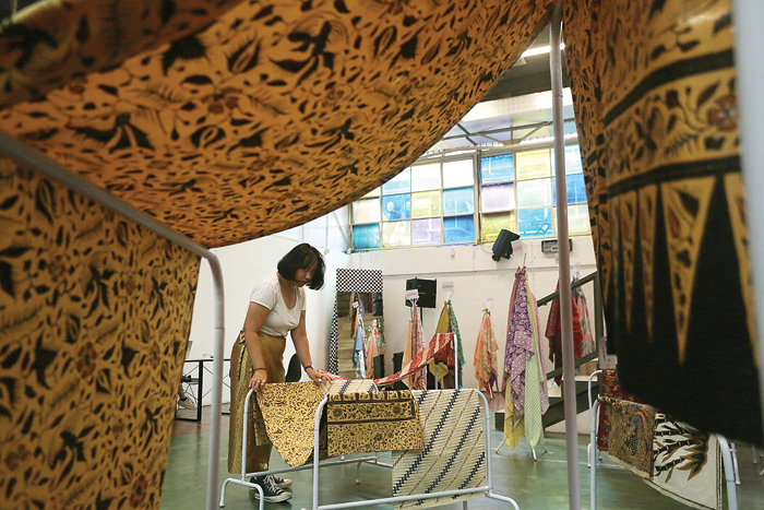 PILIH LALU PAKAI: Anggota subkomunitas Pasar Wasta merapikan kain-kain batik yang didisplai dalam perhelatan berkala Swara Bahagia di kawasan M Bloc pada Rabu lalu. (SALMAN TOYIBI/JAWA POS)