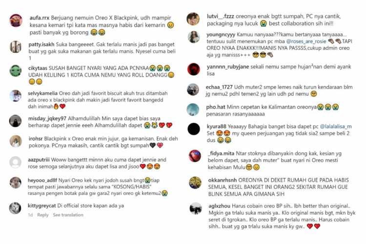 Dalam setiap unggahan itu, ada warganet yang mengaku sudah berhasil menemukan Oreo Blackpink, tetapi ada pula yang masih kesulitan menemukan produk kolaborasi tersebut.