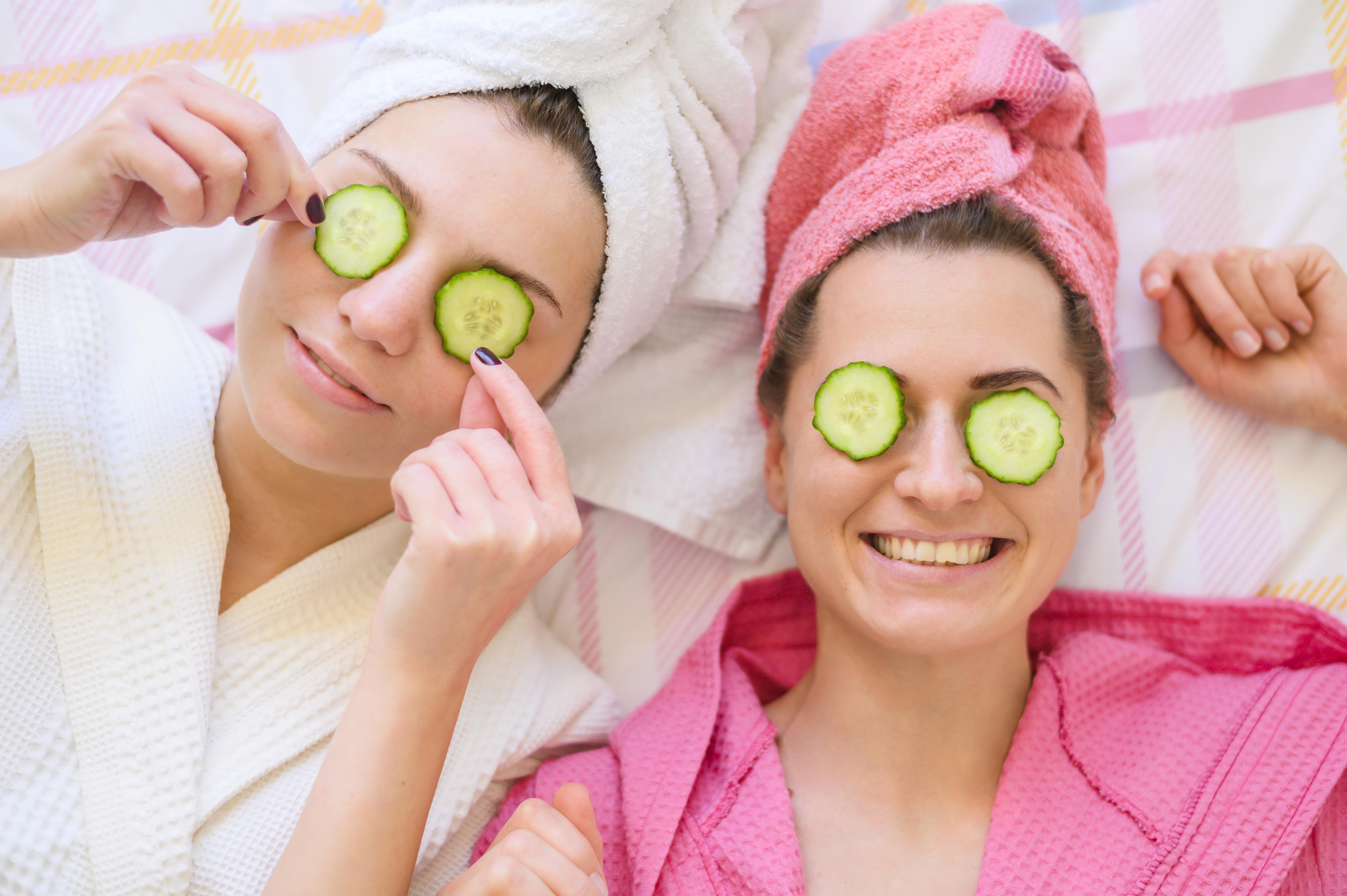 Ilustrasi dua orang wanita yang sedang menggunakan irisan timun di bagian mata. (Freepik.com)
