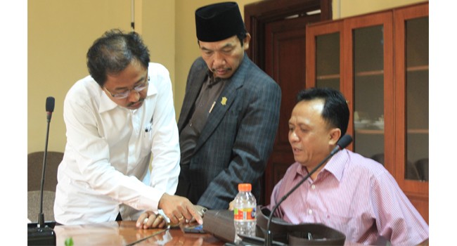 IKI LHO: Agus Santoso menunjukkan foto-foto pengurus DPD Hanura Jatim kepada Anggota BK DPRD Surabaya Baktiono (kiri) dan Buchori Imron (tengah).
